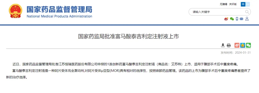 2024年1月31日,中國國家藥品監(jiān)督管理局(NMPA)官網(wǎng)宣布批準恒瑞醫(yī)藥1類創(chuàng)新藥“富馬酸泰吉利定注射液”(商品名:艾蘇特)上市,適應癥為腹部手術(shù)后中重度疼痛。 湖北天勤生物科技股份有限公司(以下簡稱“天勤生物”)表示熱烈祝賀。天勤生物子公司湖北天勤鑫圣生物科技有限公司(以下簡稱“天勤鑫圣”)作為“富馬酸泰吉利定注射液”項目的合作伙伴,與恒瑞醫(yī)藥緊密配合,在3.5個月內(nèi)完成了該品種關(guān)鍵代謝產(chǎn)物的重復給藥毒性試驗、生殖二段試驗和遺傳毒性試驗研究,為“富馬酸泰吉利定注射液”新藥的獲批上市提供了有力支持。 “富馬酸泰吉利定注射液”是一種阿片受體完全激動劑,對阿片受體μ亞型(MOR)具有相對的選擇性,按照麻醉藥品管理。研究數(shù)據(jù)顯示,該藥物不僅鎮(zhèn)痛效果顯著,起效速度快,能有效延緩術(shù)后疼痛反彈需補充鎮(zhèn)痛的時間;并且在保證鎮(zhèn)痛效果的同時,大幅降低了惡心、嘔吐和呼吸抑制等常見不良反應的發(fā)生率,極大地提升了患者的治療舒適度和安全性。 天勤生物祝賀“富馬酸泰吉利定注射液”順利獲批上市,該藥品的上市為腹部手術(shù)后中重度疼痛患者提供了新的治療選擇。同時,天勤生物將不斷探索和...